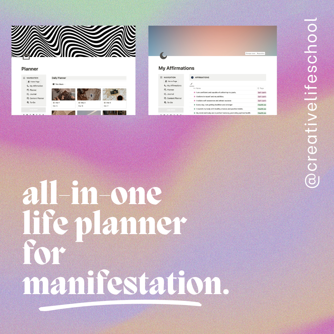 So excited for you to get your manifesting hands on this! I worked on it with a Notion expert, so it could help organise all aspects of your life, keep your daily affirmations organised, and give you a place to be creative and successfully plan your days, weeks, and months!